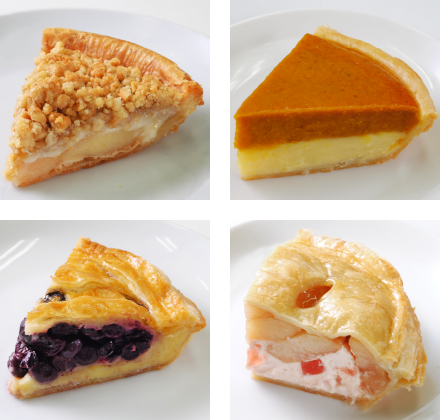 バナナパイ、レモンパイ、サワークリームアップルパイ、ピーチパイ、ブルーベリーパイ、チェリーパイ、クリームチーズアップルパイ、パンプキンパイ、きのこのキッシュ…etc。